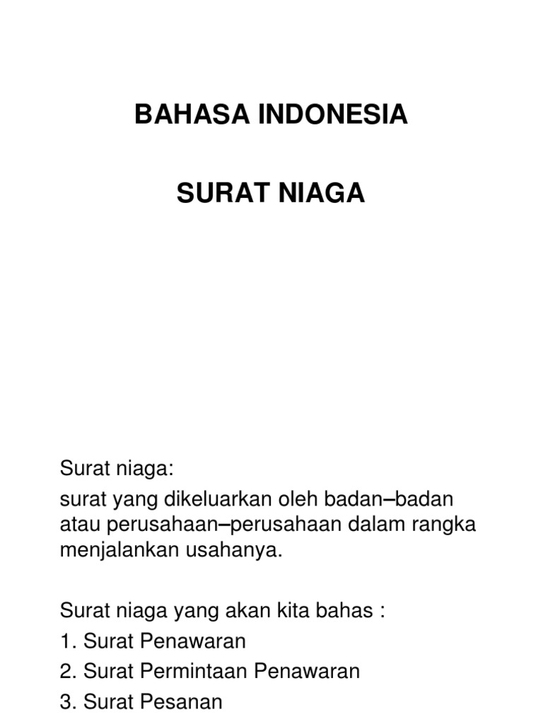 Surat niaga adalah suatu surat yang digunakan dalam kegiatan perniagaan yang dikeluarkan oleh perorangan ataupun perusahaan dalam rangka menjalankan usahanya untuk mendapatkan suatu. Pengertian, fungsi, jenis dan contohnya. Surat niaga merupakan surat resmi yang isinya berupa tawaran, jual beli barang mapun jasa. Surat niaga ini dapat bersifat intern maupun ekstern. Surat niaga sendiri terbagi dua yaitu extren dan intern.